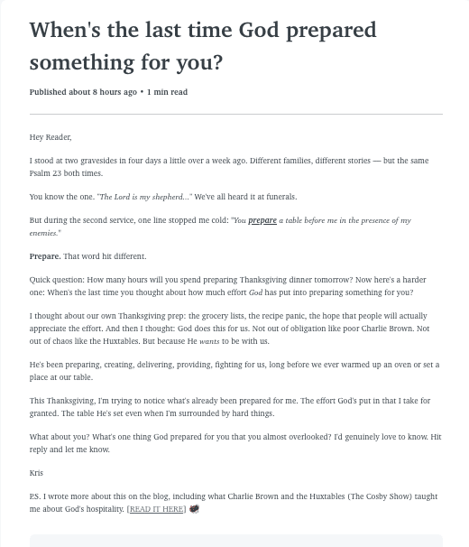 Join readers who get weekly reflections on noticing God in ordinary moments: from grocery stores to traffic jams, broken appliances to unexpected kindnesses.